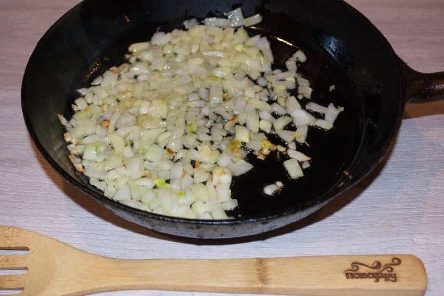4. На растительном масле обжарьте сначала репчатый лук. Помешивайте, чтобы ничего не пригорело.