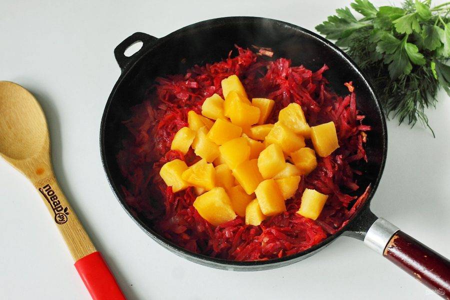 Обжарьте все вместе до полной готовности, добавьте нарезанную кубиками тыкву.