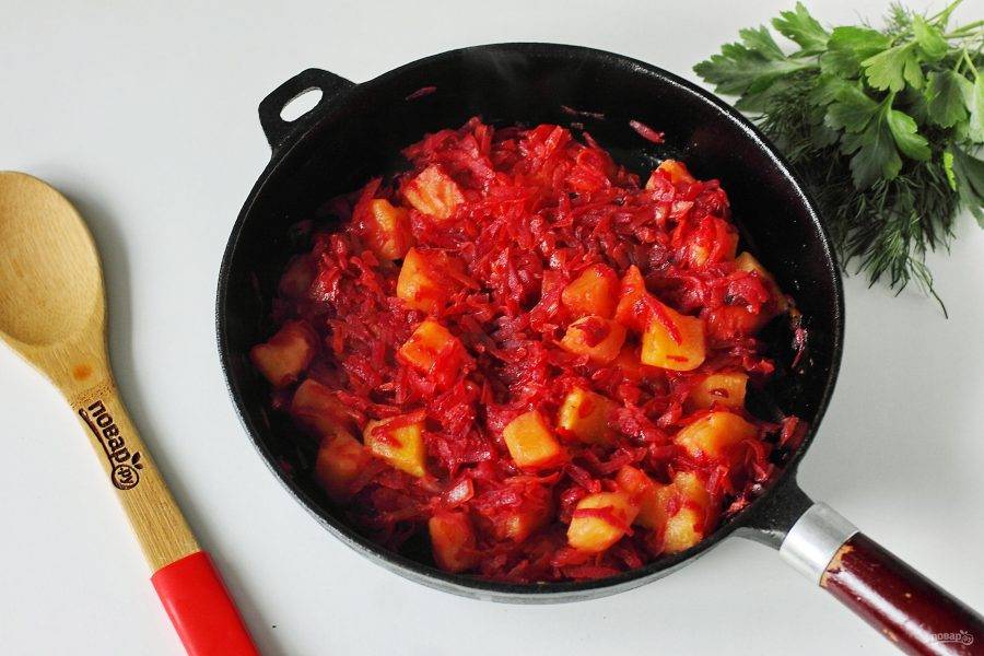 Тем временем на сковороде разогрейте масло и выложите тертую морковь и нарезанный кубиками лук. Обжарьте овощи до мягкости и добавьте тертую свеклу.