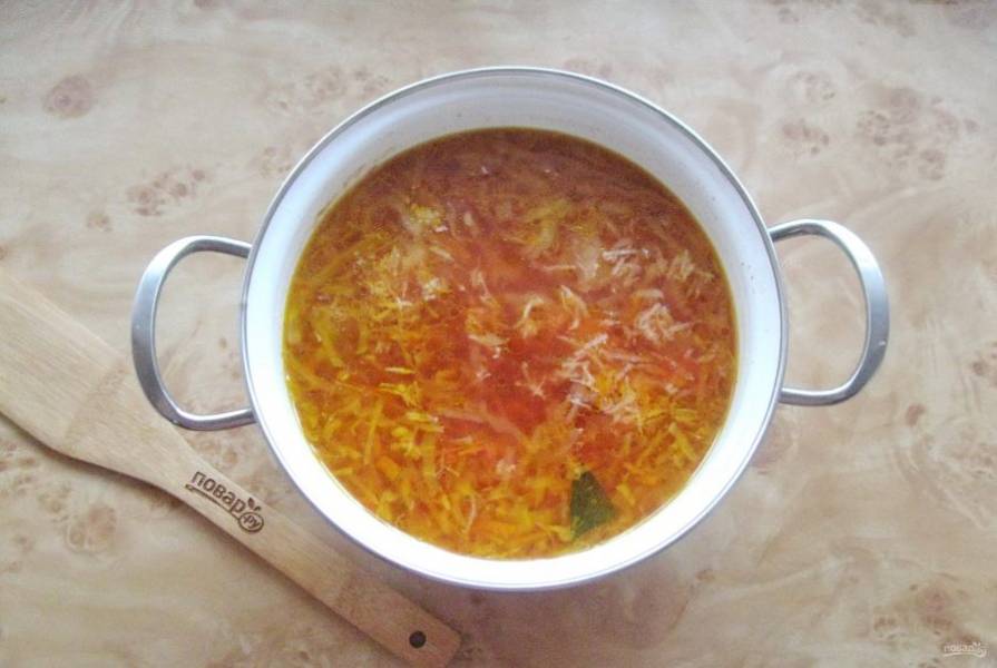 Борщ посолите и поперчите по вкусу. За 10 минут до окончания приготовления добавьте лавровый лист. Варите до готовности всех ингредиентов.