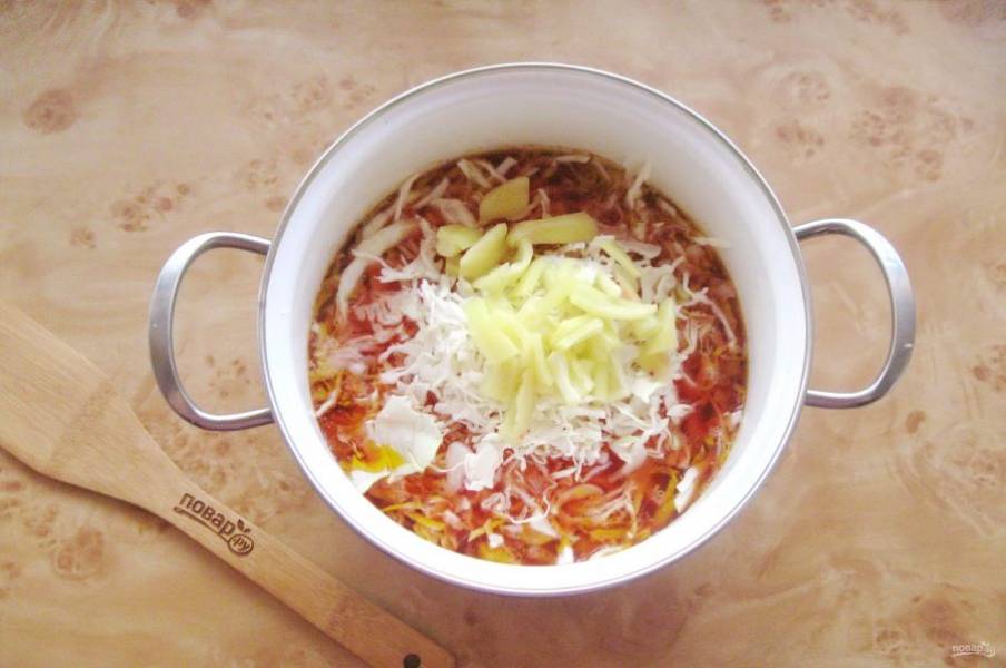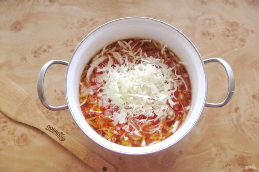 Капусту тонко нашинкуйте и добавьте в борщ.