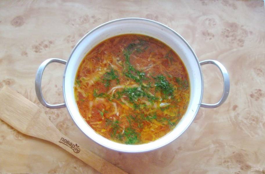 Готовый борщ приправьте измельченным чесноком и нарезанной зеленью.