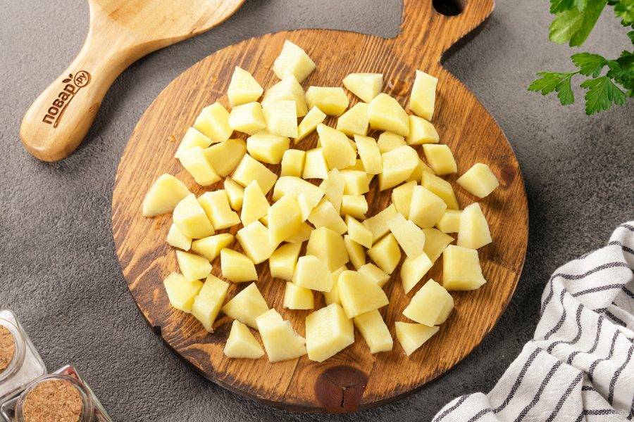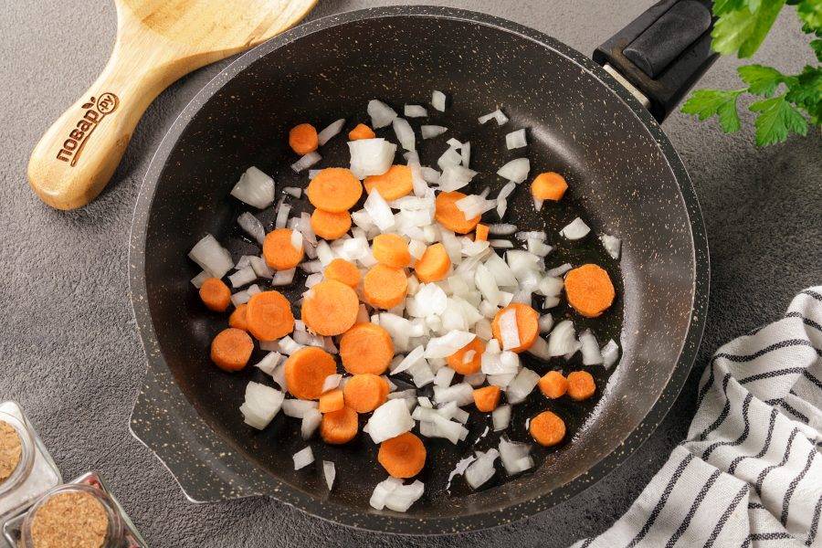 Тем временем разогрейте сковороду с маслом. Выложите нарезанные лук и морковь. Нарезка может быть любая, как вам больше нравится.