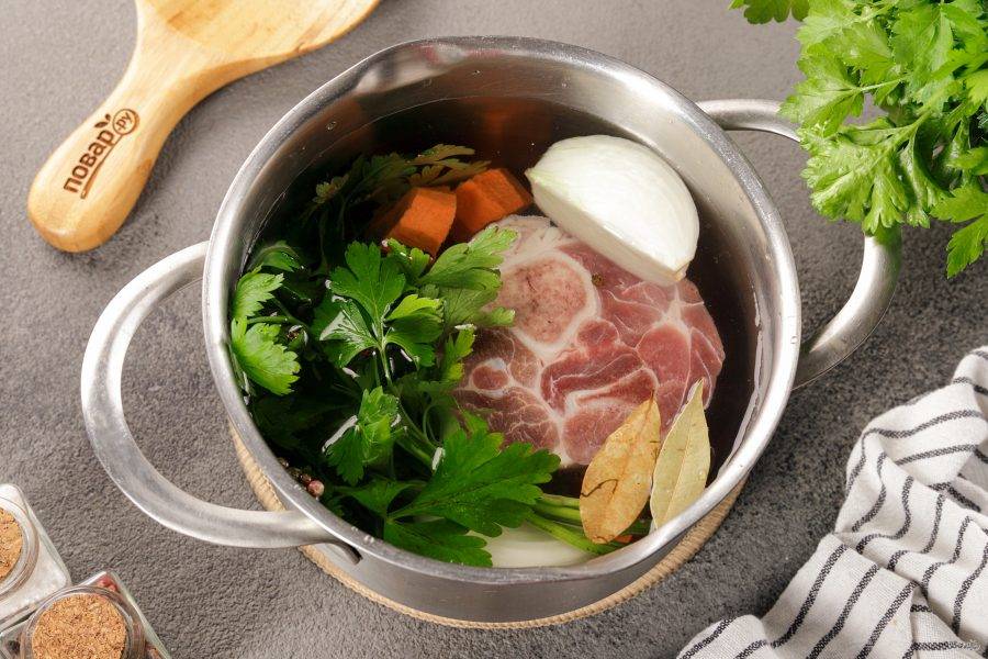 Мясо промойте и переложите в кастрюлю. Добавьте одну морковку и одну луковицу, нарезанные на части. Петрушку перевяжите ниткой, чтобы её легче было потом удалить. Добавьте так же лавровый лист и перец горошком. Залейте всё водой.