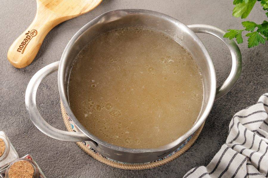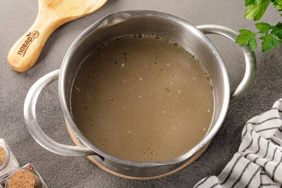 Отправьте кастрюлю на огонь. В момент закипания снимите ложкой образовавшийся шум и снизьте огонь к минимуму. Продолжайте варить до готовности мяса.