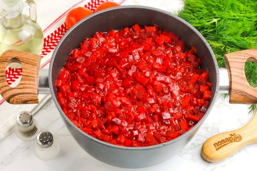 Прогрейте в казане или кастрюле с антипригарным дном растительное масло и выложите свекольно-морковную массу. Обжарьте в течение 10 минут, время от времени перемешивая.