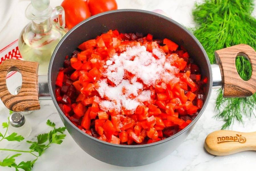 Всыпьте соль. Если любите чуть сладковатую на вкус заправку, то добавьте и сахар. Накройте емкость крышкой, перемешав все содержимое. Томите около 15 минут, время от времени перемешивая.