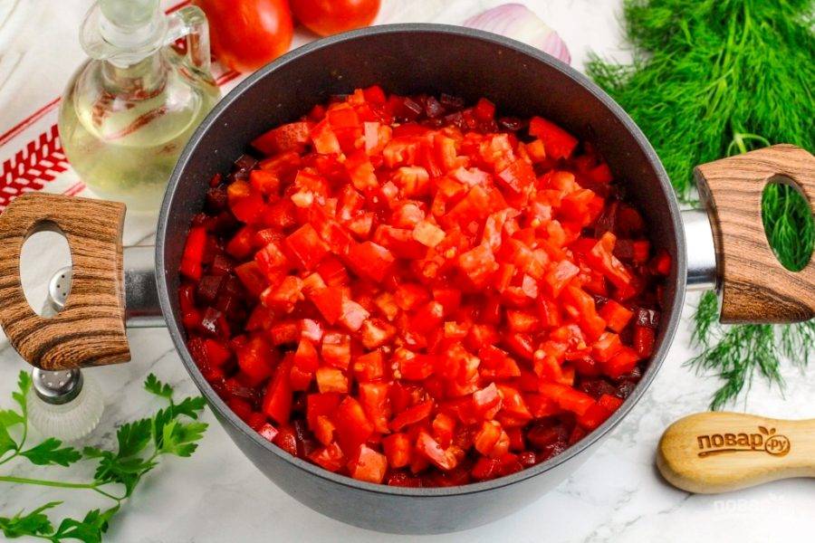 Следующими добавьте томаты, нарезав их средними кубиками. Можно перекрутить их через мясорубку — по желанию.