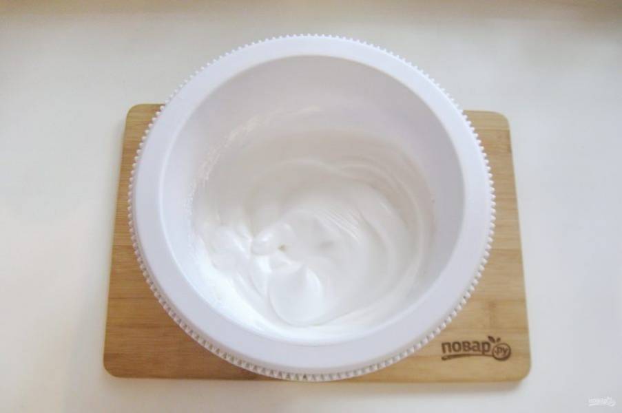 И взбейте миксером или венчиком в крутую пену. Постепенно всыпьте 150 грамм сахара, постоянно взбивая. Должна получится густая, стойкая масса.