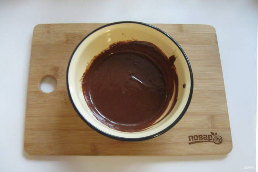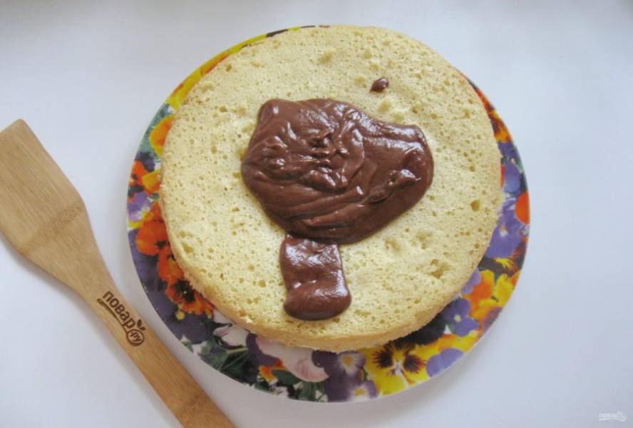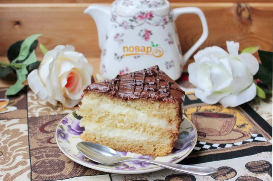 Верхний корж и бока торта смажьте шоколадной глазурью.