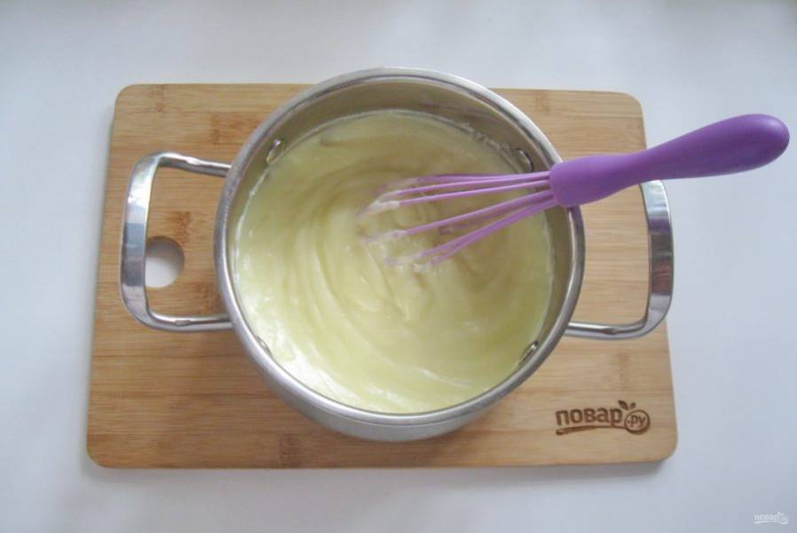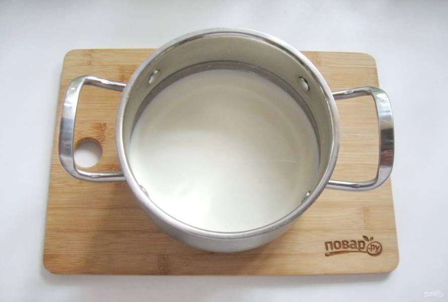 Приготовьте заварной крем. В кастрюлю налейте молоко и поставьте на плиту.
