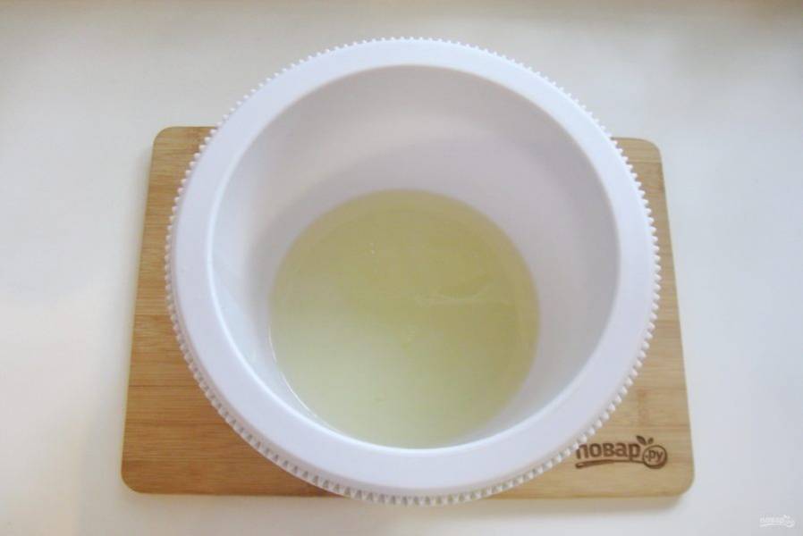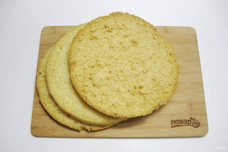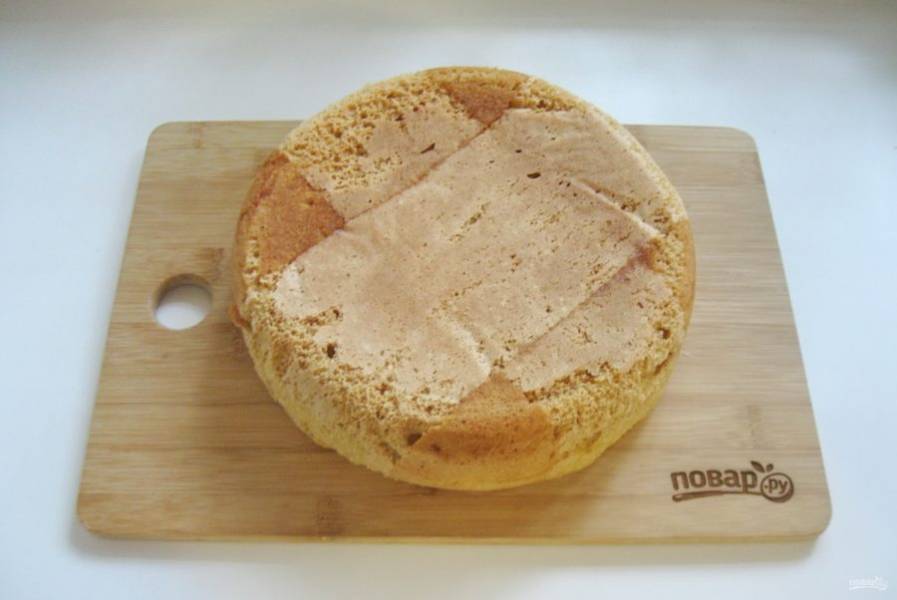 Выложите тесто в форму для выпечки. Пеките в духовке при температуре 170 градусов 40 минут. Готовность проверяйте сухой деревянной палочкой или зубочисткой. Готовый бисквит выложите из формы и охладите.