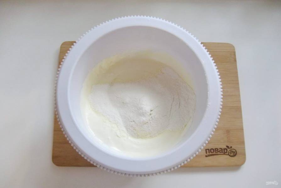 Добавьте постепенно просеянную муку. А также разрыхлитель.