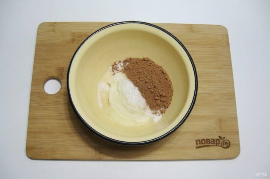 Приготовьте глазурь для торта. В миске смешайте сахар, сметану, какао.