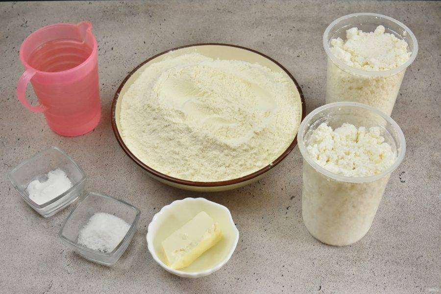 Подготовьте продукты для приготовления дагестанских лепешек. Творог желательно взять сухой, жирностью не менее 5%.