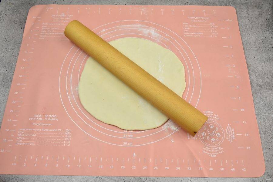 Получившийся "узелок" с начинкой внутри аккуратно раскатайте скалкой в лепешку, диаметром 24 см. и толщиной 0,5-0,7 мм.