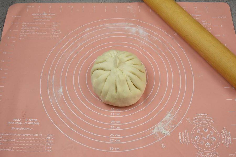 Отдохнувшее тесто разделите на 6 частей, примерно по 160-170 граммов. Каждую часть округлите и выложите на доску. Накройте заготовки пищевой пленкой, чтобы избежать подсыхания.