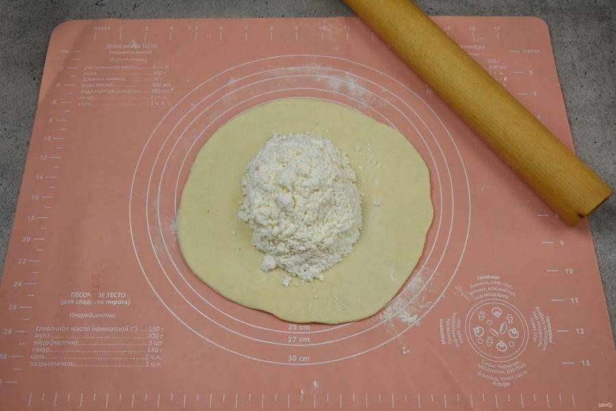 В центр лепешки выложите часть творожной начинки, примерно 110 граммов.