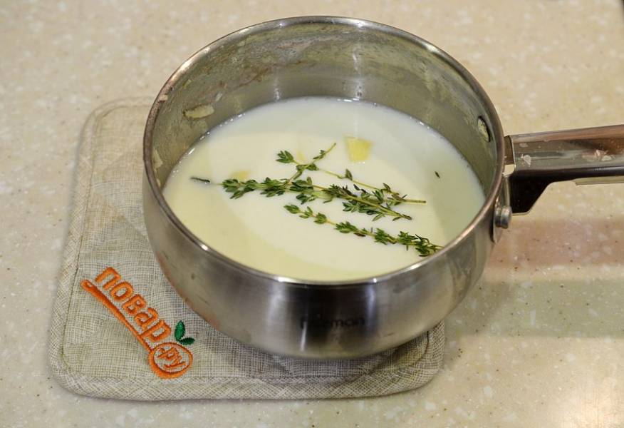 3. Картофель очистите, нарежьте кубиком. Отварите в смеси молока и сливок с чесноком и тимьяном до размягчения картофеля.
