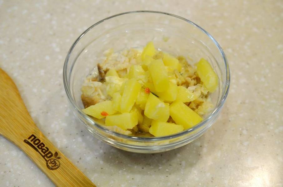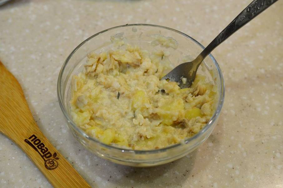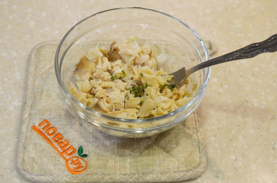 2. Рыбу разомните вилкой, оставшееся масло слейте.
