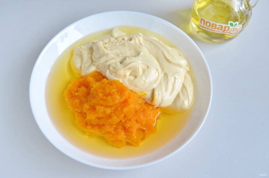 6. К тыквенному пюре добавьте масло растительное, треть теста, перемешайте хорошо.