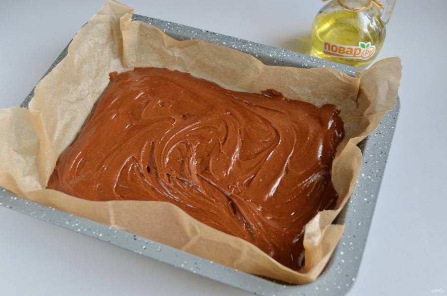 8. Форму застелите пергаментом для выпечки. Вылейте две трети шоколадного теста и разровняйте.