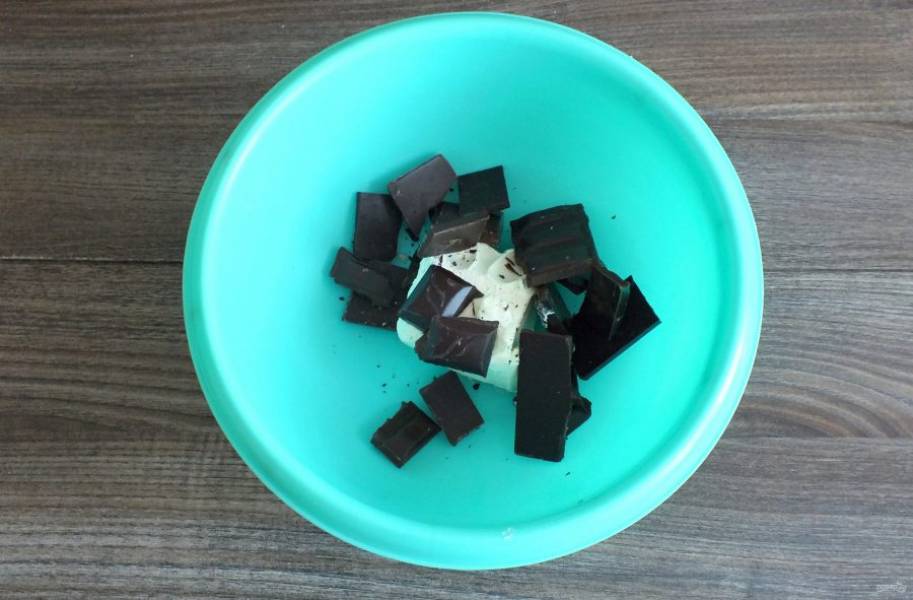 Приготовьте тесто. В чаше соедините шоколад и масло комнатной температуры. Поставьте чашу на водяную баню и растопите до однородного состояния.