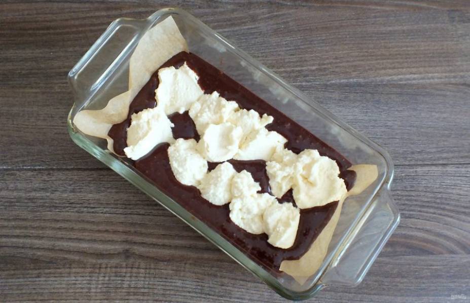 Возьмите прямоугольную или квадратную форму. Застелите её пекарской бумагой. Вылейте половину теста. Разложите начинку на тесто. Распределять её не нужно, достаточно выложить небольшими бугорками.