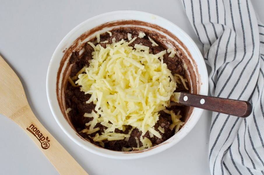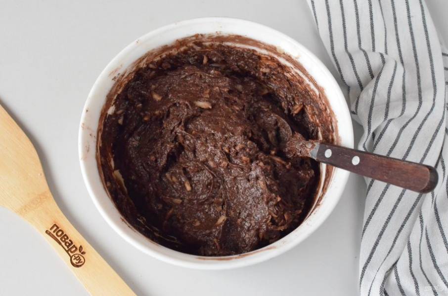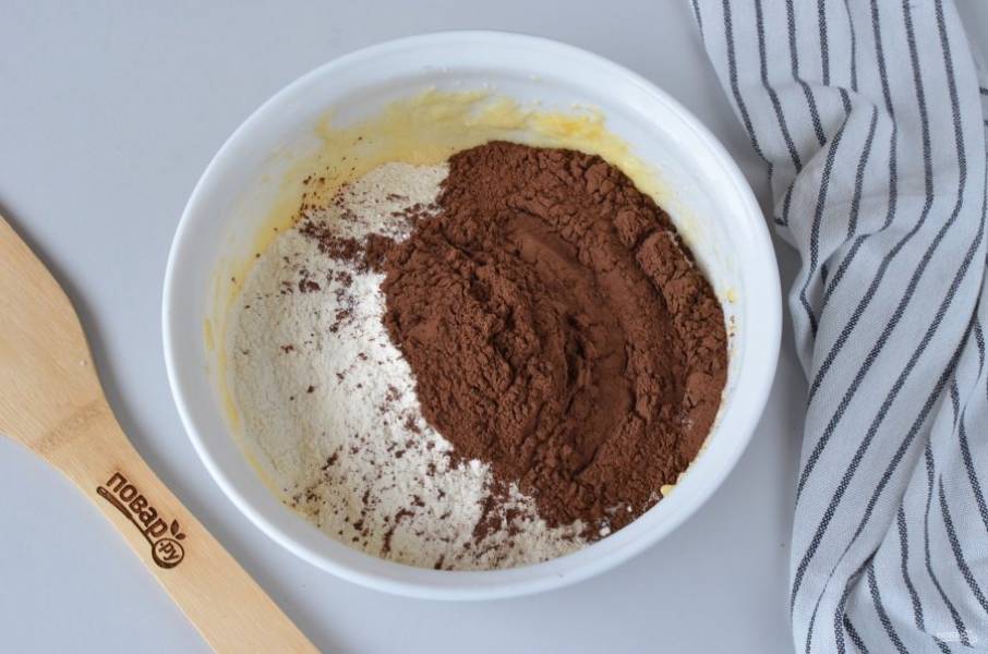 Добавьте муку и какао. Ложкой немного перемешайте, чтобы мука увлажнилась.