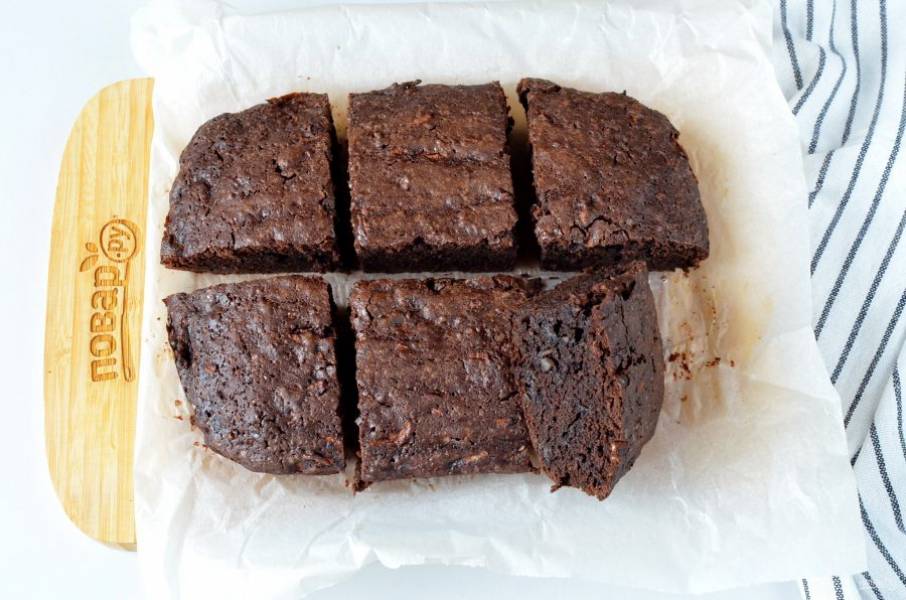 Дайте брауни полностью остыть, и только после этого нарежьте на квадраты. Можно также убрать их на несколько часов в холодильник, холодные брауни будут иметь совсем другую текстуру нежели тёплые. Тёплые брауни более рассыпчатые, больше похожи на влажный плотный бисквит, а холодные имеют более вязкую и плотную структуру. Тут, конечно, дело вкуса, но мне больше нравится брауни, выдержанные несколько часов в холодильнике.