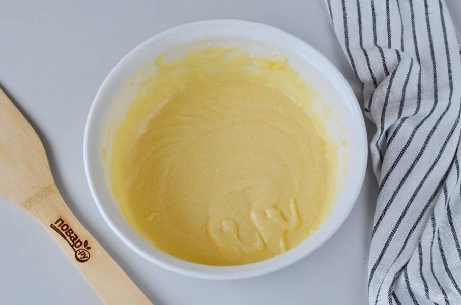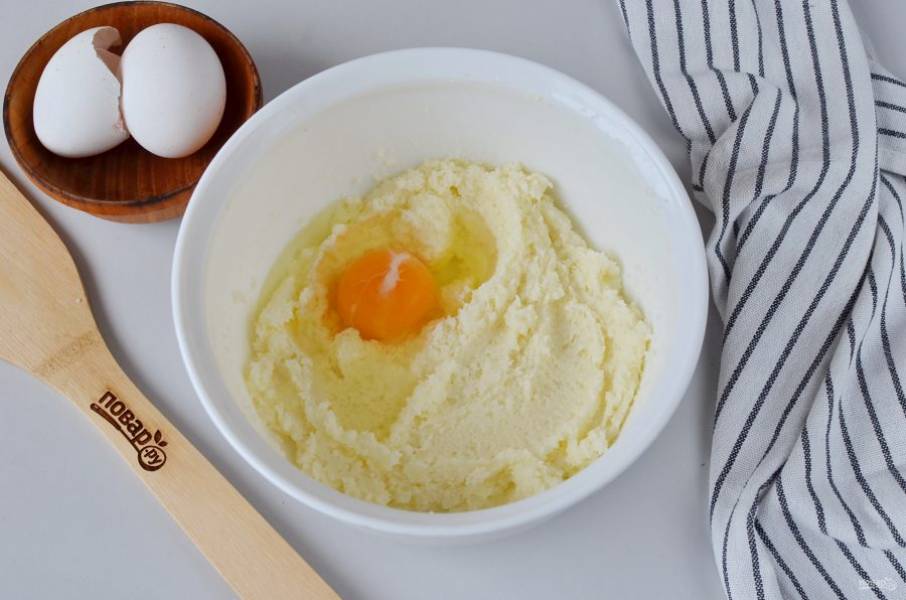 Вводите по одному яйцу, тщательно взбивая, чтобы масса была однородной.