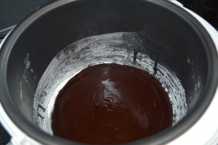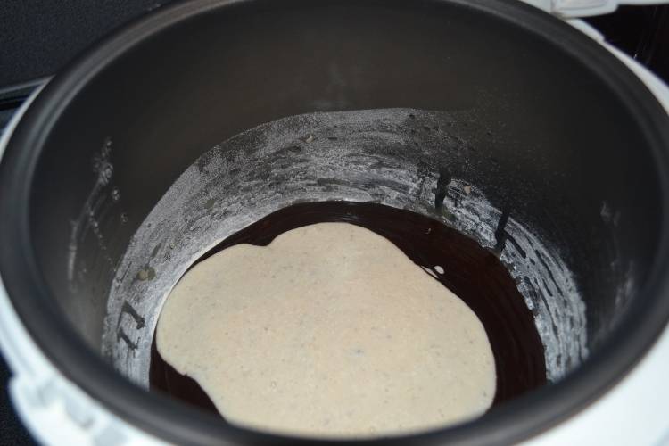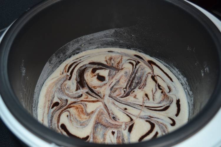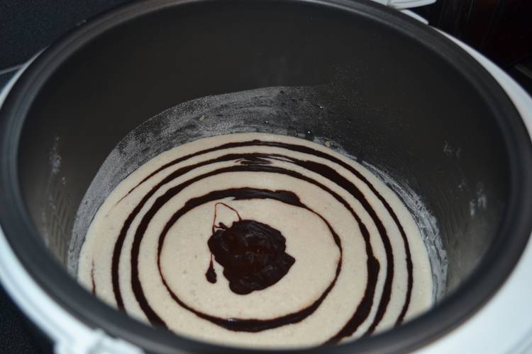 Затем влейте чуть меньше половины шоколадного теста и равномерно распределите его по дну емкости.