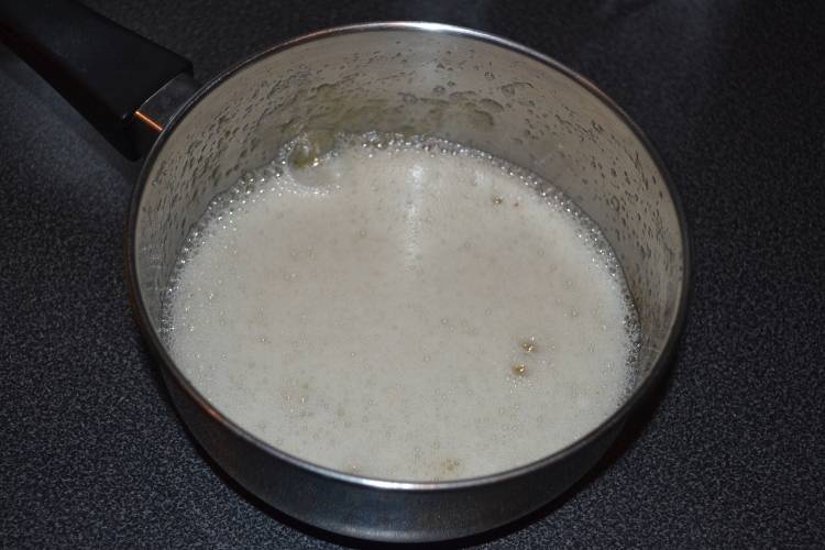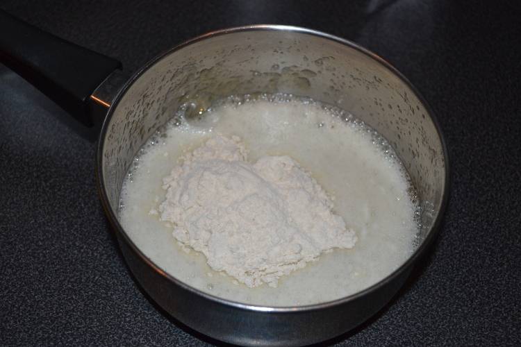 Добавьте в полученную смесь муку и хорошо перемешайте до однородности.