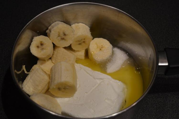 Теперь займемся банановой смесью. В глубокой емкости смешайте бананы, нарезанные на средние по величине кусочки, творог, 2 ст.л. сахара и 2 яйца.