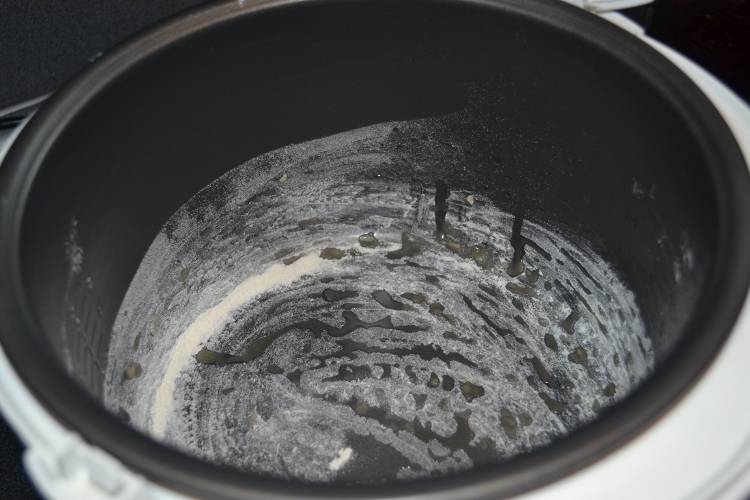 Дно кастрюли мультиварки смажьте растительным маслом и присыпьте мукой.
