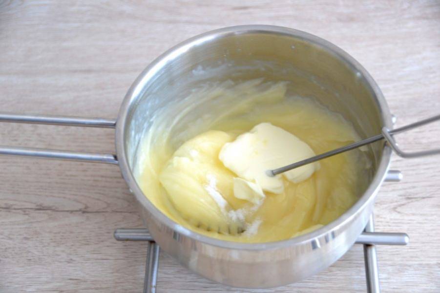 Нагрейте смесь на среднем огне при постоянном помешивании до загустения, но не переварите. Как только смесь начнет густеть, снимайте с огня. Добавьте в заварную часть крема сливочное масло и ванильный сахар, смешайте.