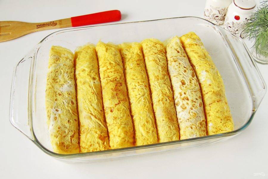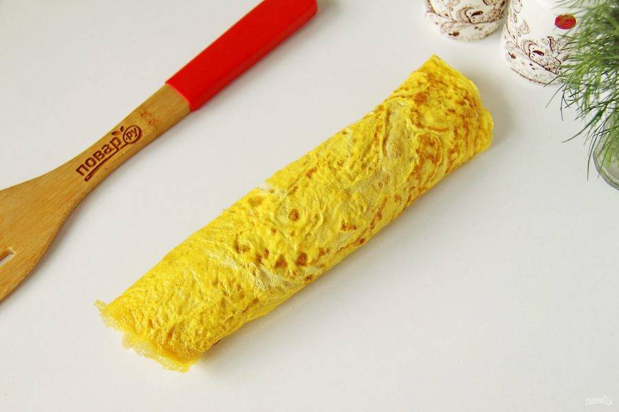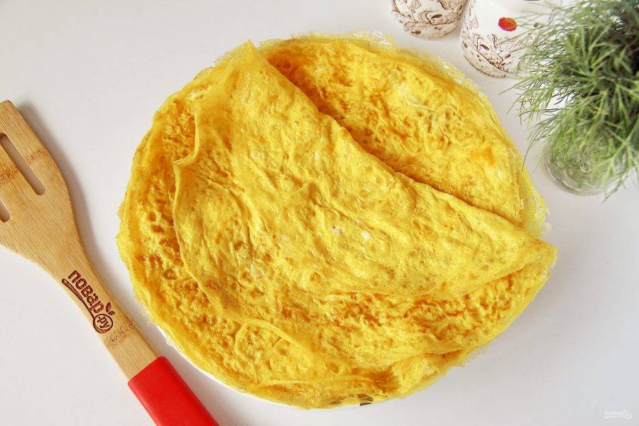 Смажьте сковороду маслом, хорошо прогрейте ее и вылейте взбитое яйцо. Обжарьте получившийся омлет с двух сторон. Сильно зажаривать не нужно, достаточно, чтобы яйцо схватилось. Таким образом приготовьте все бризоли.