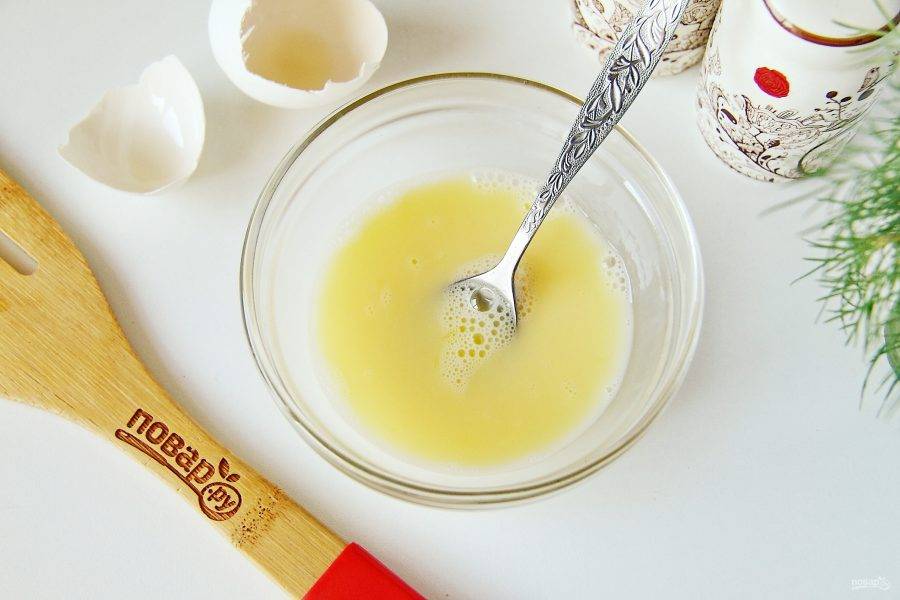 Приступаем к выпеканию бризолей. Для этого поочередно взбейте одно яйцо с щепоткой соли и 1 ч.л. молока. Таким образом из 7 яиц, должно получится в итоге 7 бризолей. Можно смешать все яйца и молоко вместе, но так у нас выйдут порционные "бризольки", одинаковые по толщине и размеру.