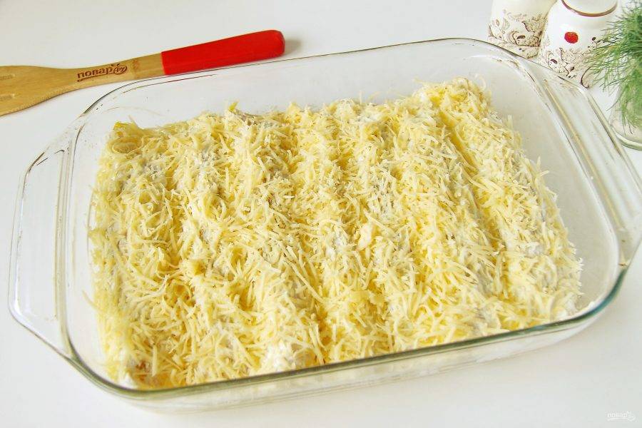 Смажьте верх сметаной и посыпьте тертым сыром. Запекайте в духовке при температуре 180 градусов около 30 минут.