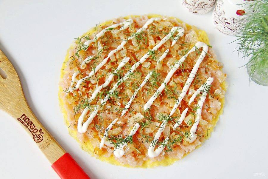 Смажьте начинку майонезом и посыпьте свежей зеленью.