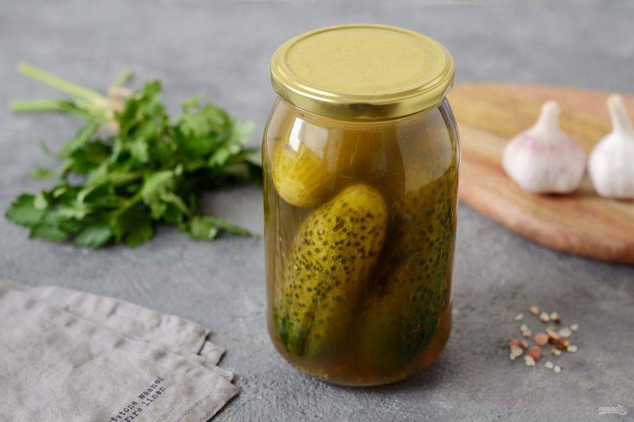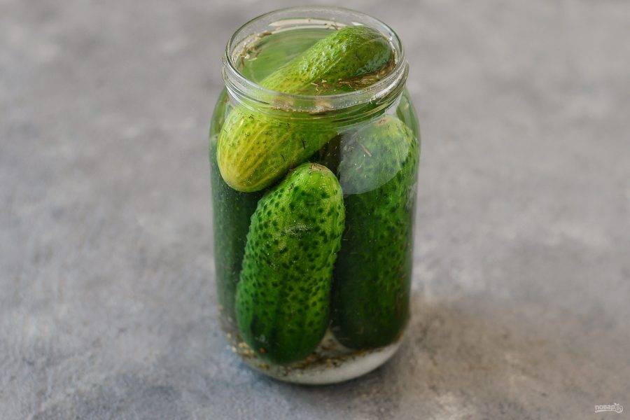 Влейте горячий рассол обратно в банку с огурцами. Закрутите предварительно стерилизованной крышкой. Оставьте остывать. Затем банку можно убрать в темное и прохладное место.