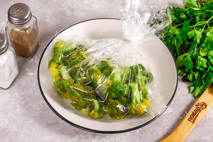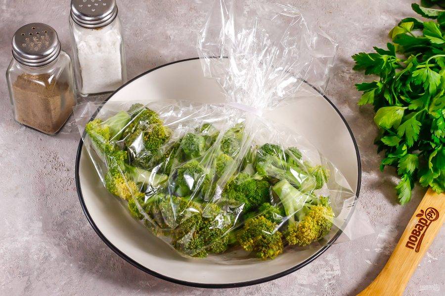 Подготовьте вакуумный пакет или плотный пакет с застежкой. Выложите в него соцветия брокколи, всыпьте соль и молотый черный перец. Удалите из пакета воздух с помощью техники или соломинки. Плотно завяжите пакет. Если будете готовить для детей, то добавьте 20 грамм сливочного масла в пакет.