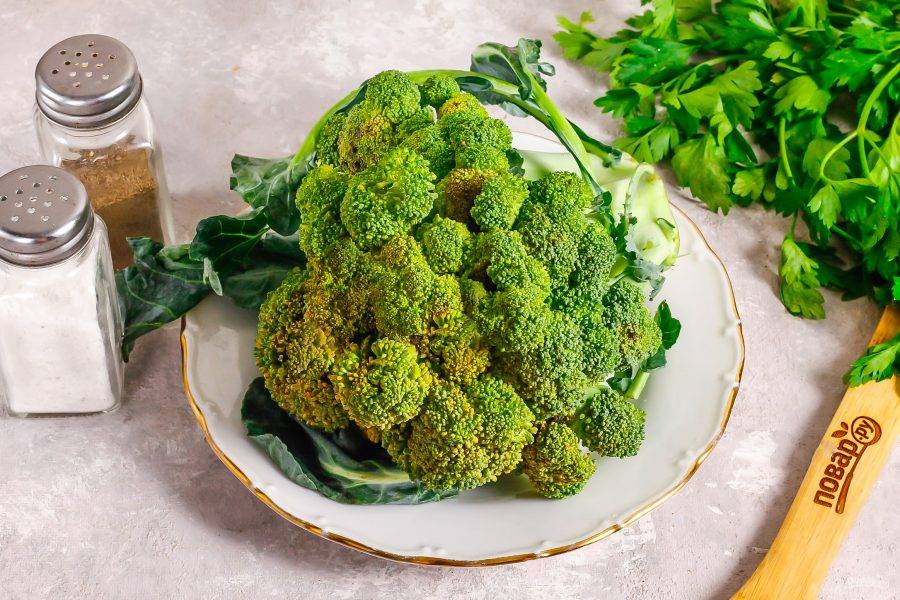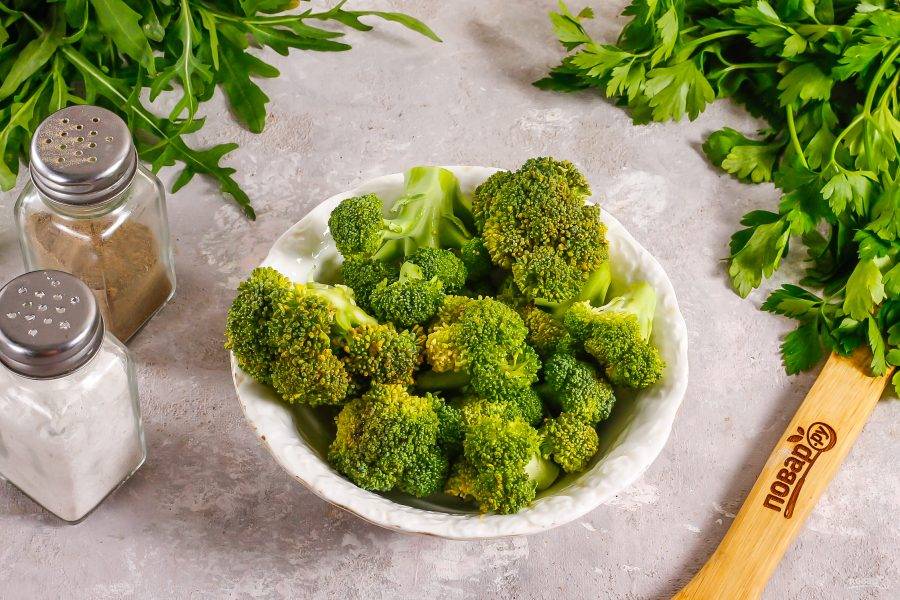 Брокколи промойте в воде, срежьте соцветия с основного стебля. Удалите поврежденные или подпорченные.