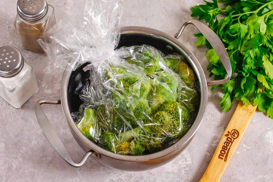Прогрейте в кастрюле воду, но не до кипения, поместив емкость на самую маленькую конфорку и включив минимальный нагрев. Вода даже не должна подрагивать, но с ее поверхности должен уходить пар. Выложите пакет с капустой в воду, желательно использовать гнет, так как он не будет погружаться в жидкость. Протомите в воде соцветия 40-45 минут, перевернув пакет 1-2 раза в процессе варки.