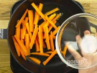 На ту же сковородку наливаем масло и 2-3 минуты обжариваем морковку, нарезанную соломкой.