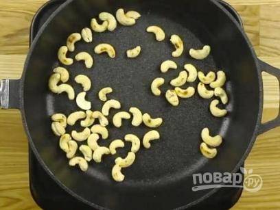 На сухой горячей сковороде несколько минут обжариваем кешью.