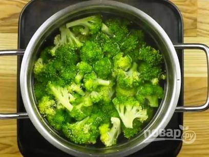 Брокколи разберите на соцветия и бланшируйте: кидаем в кипящую воду на несколько минут, а затем достаем и выкладываем на лед.