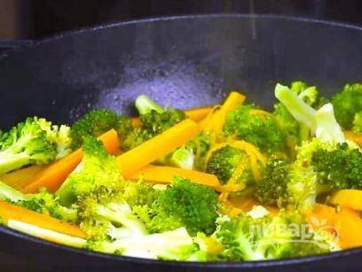 Затем добавляем брокколи, перемешиваем и жарим 2-3 минуты.