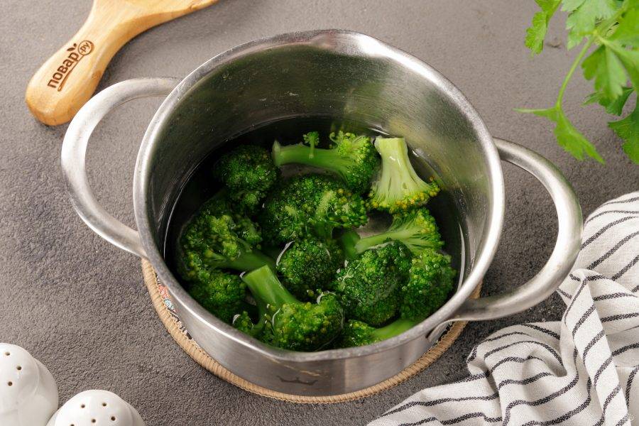 Разберите брокколи на мелкие соцветия, отварите в чуть подсоленной воде минуты 3, обдайте ледяной водой, чтобы сохранить яркий цвет и все витамины, откиньте на дуршлаг.