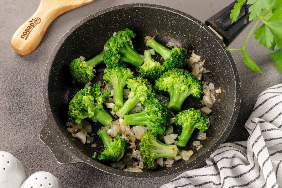 Добавьте в сковороду брокколи.